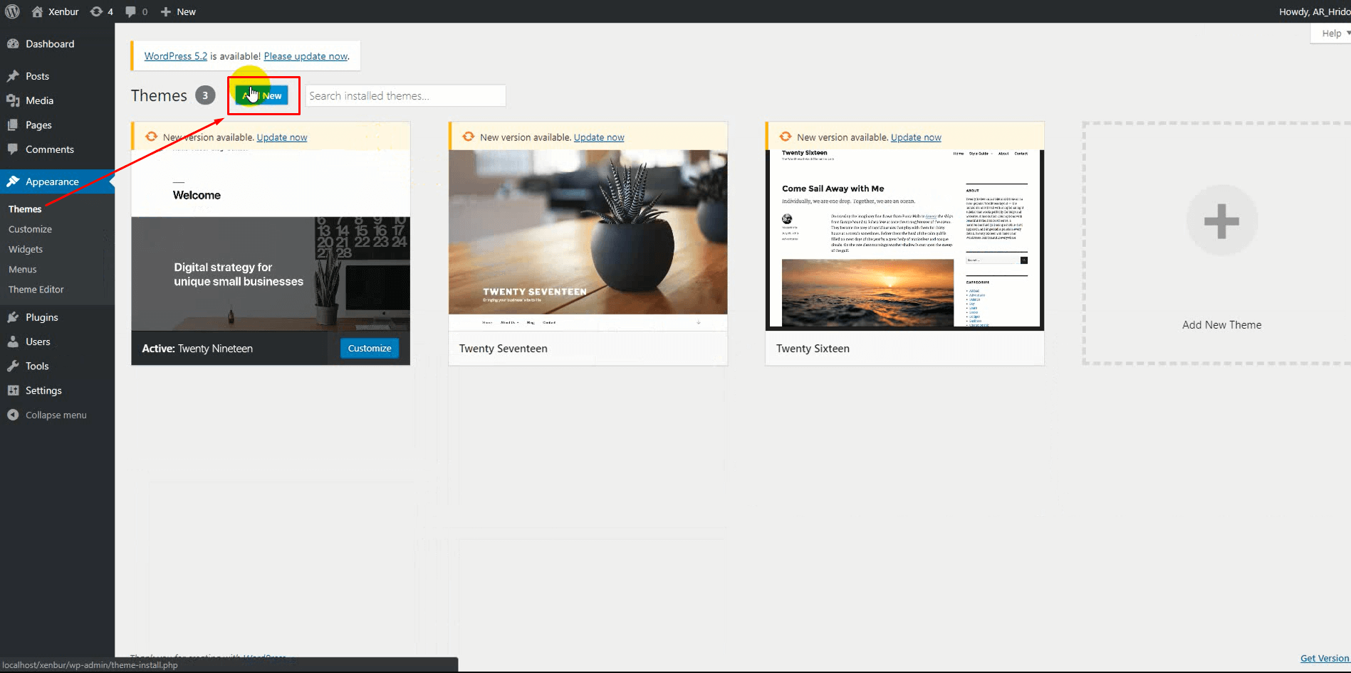 Step 2: Click Add New button at the top of the page, then the Upload Theme button on the next page.