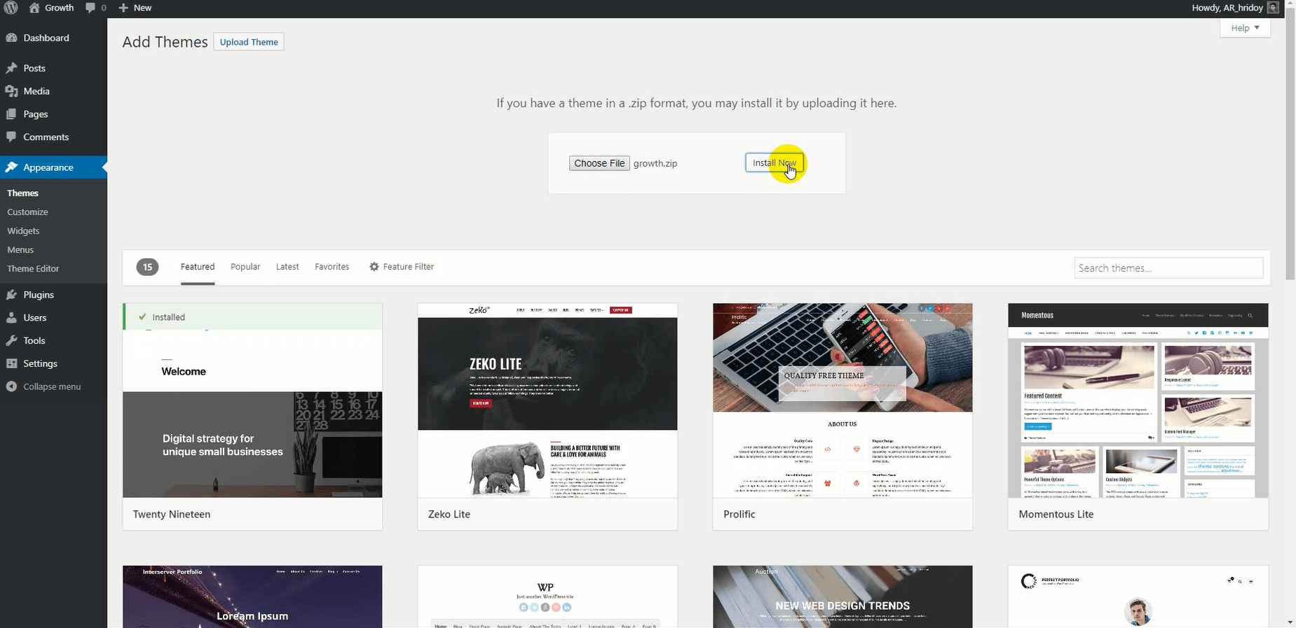 Step 3: Select Growth.zip included in the files downloaded from Themeforest and click Install Now.