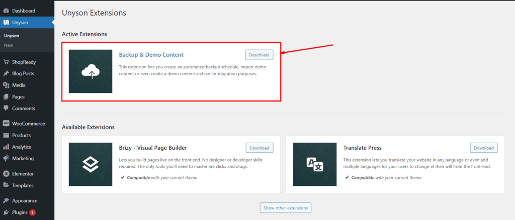 Once activated, Unyson will appear on the dashboard. Click on it and download the “Backup & Demo Content’’ extension and activate it.