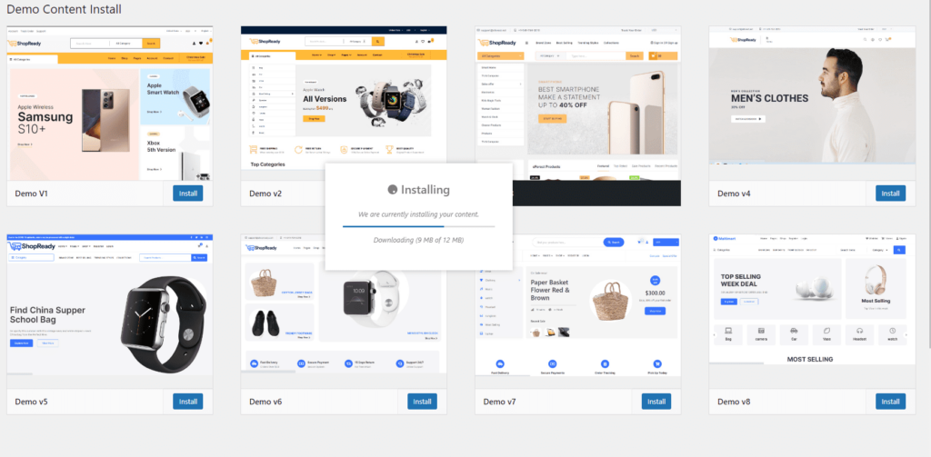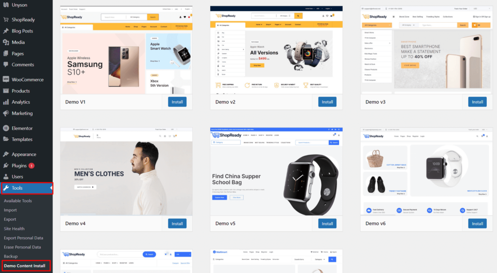 To use the included demos that come with ShopReady – WooCommerce Builder plugin, head over to WordPress Dashboard > Tools > Demo Content Install.