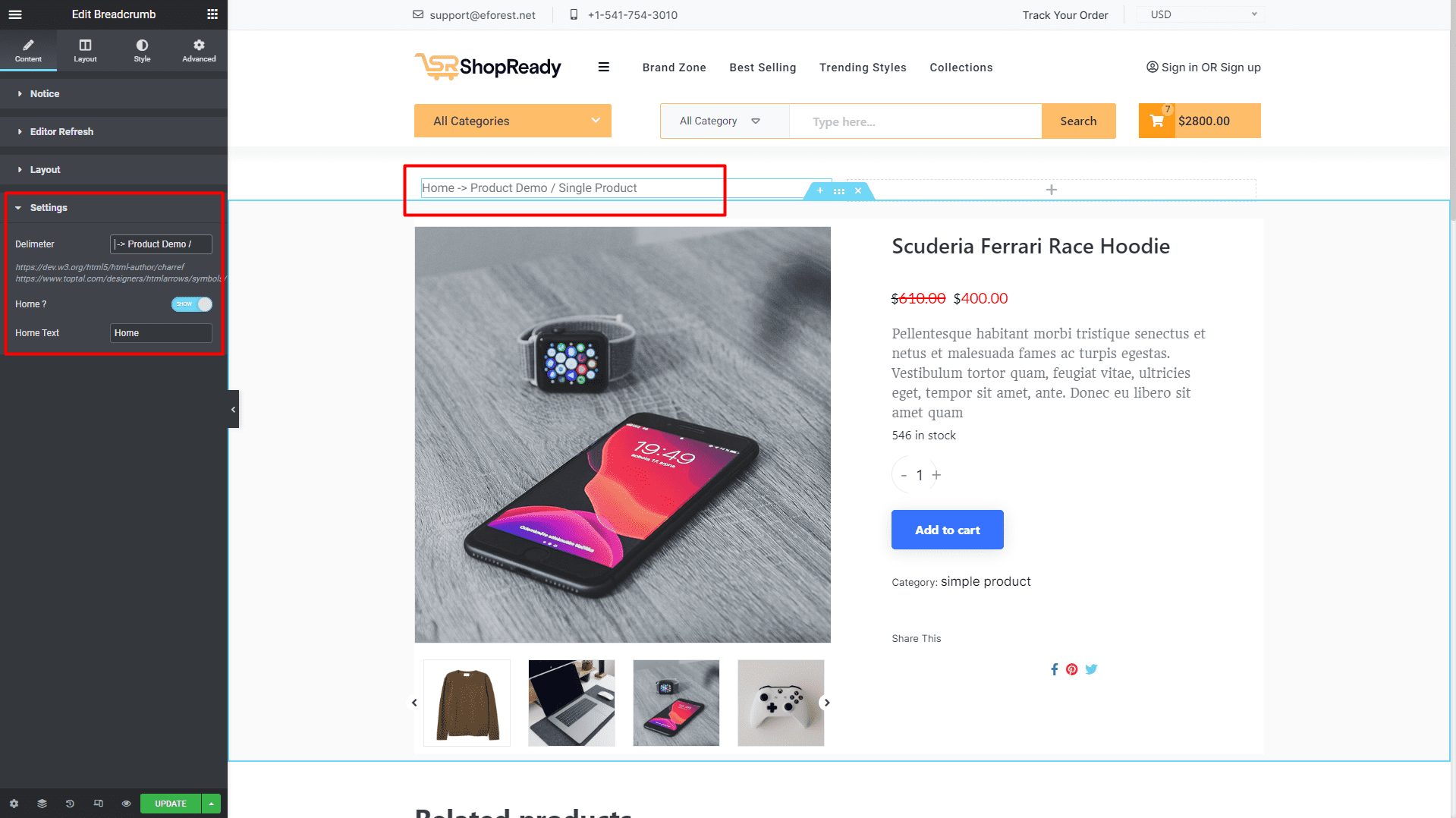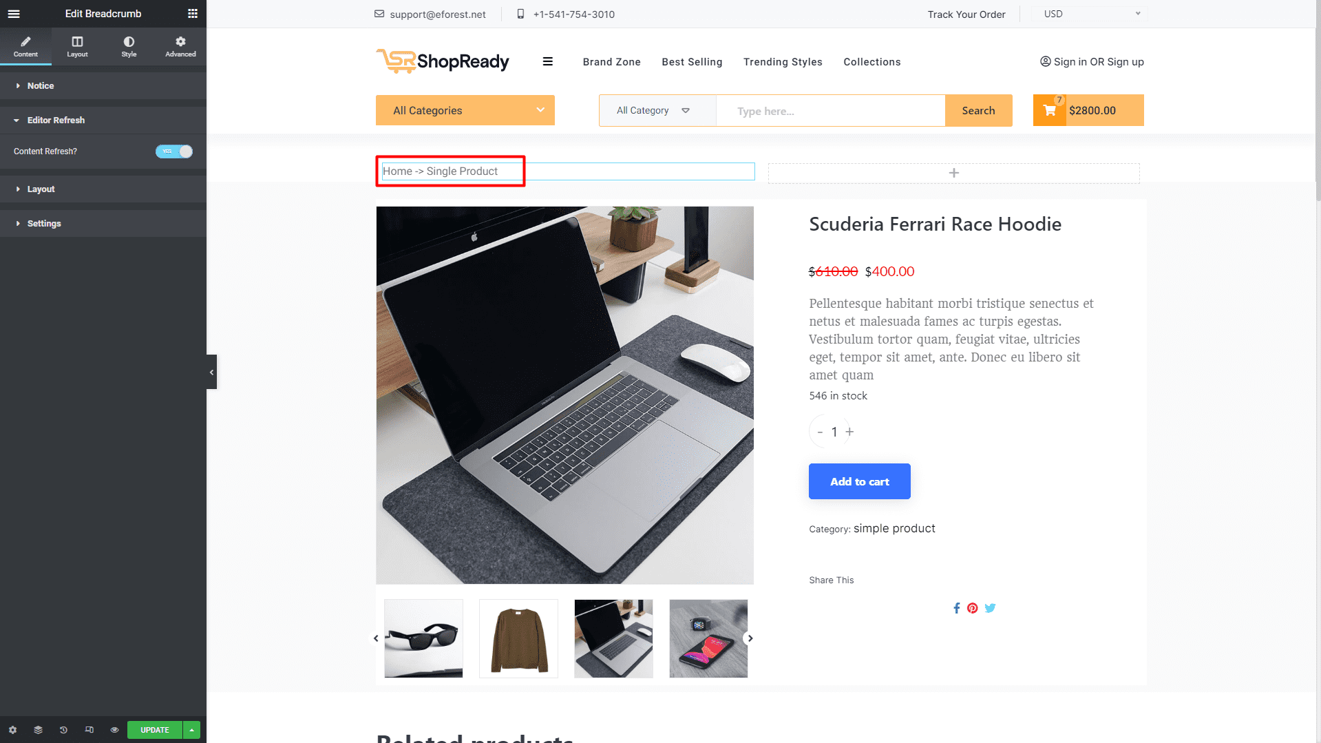 From the left-hand side, search for the ShopReady Breadcrumb widget. And drop it over the product title.