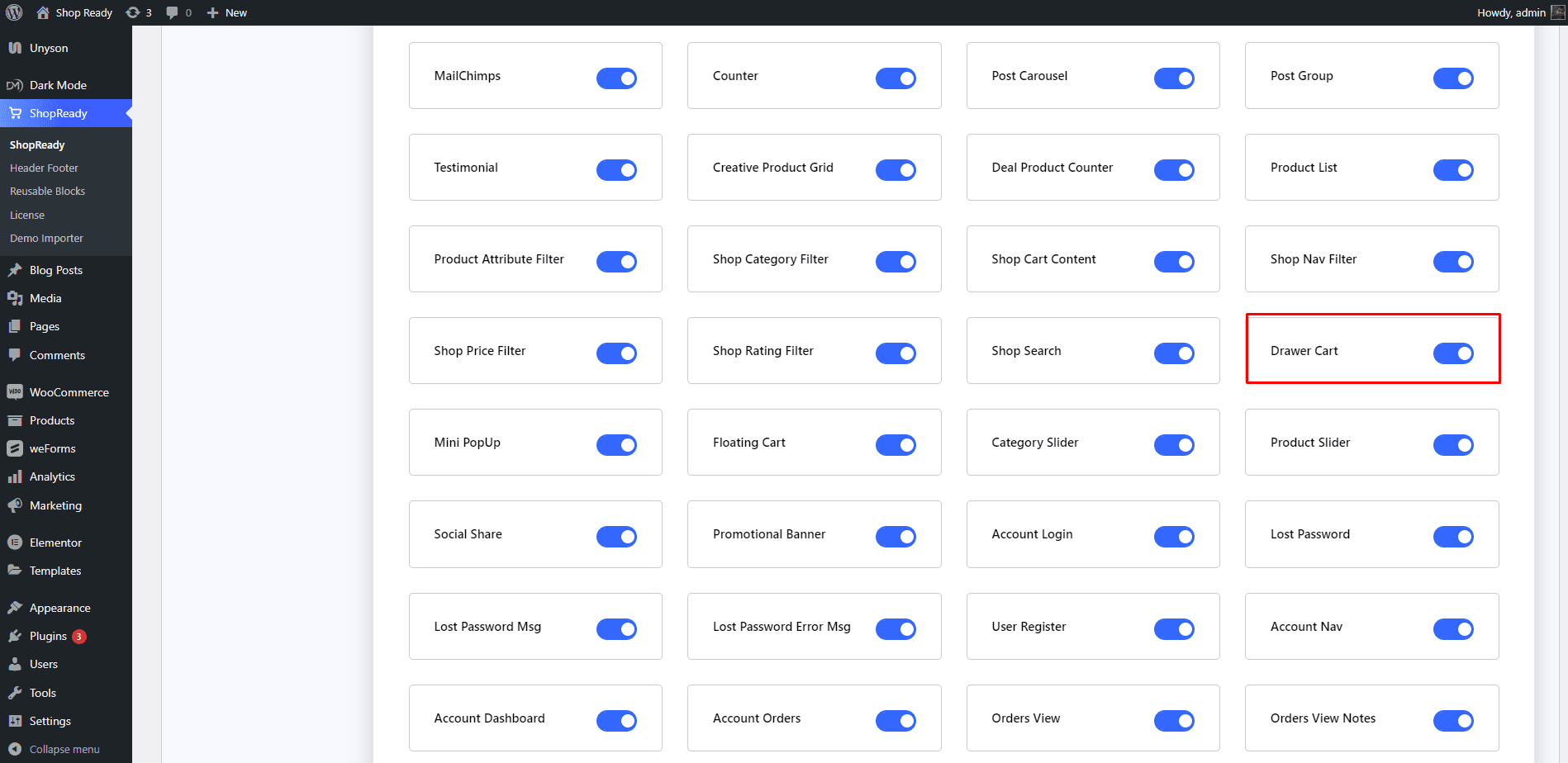 To use the Drawer Cart widget in the header section, you’ll need to enable the Header Footer module from the ShopReady dashboard and click on Save Changes.