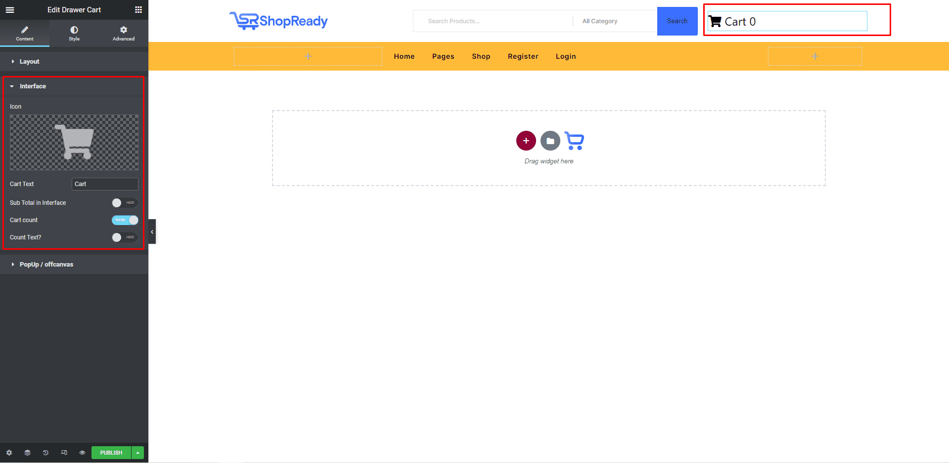 To start customizing the cart block, click on the Interface option under the Content tab. From here, you’ll be able to add an icon to the drawer cart and toggle between the types of information you would like it to display.