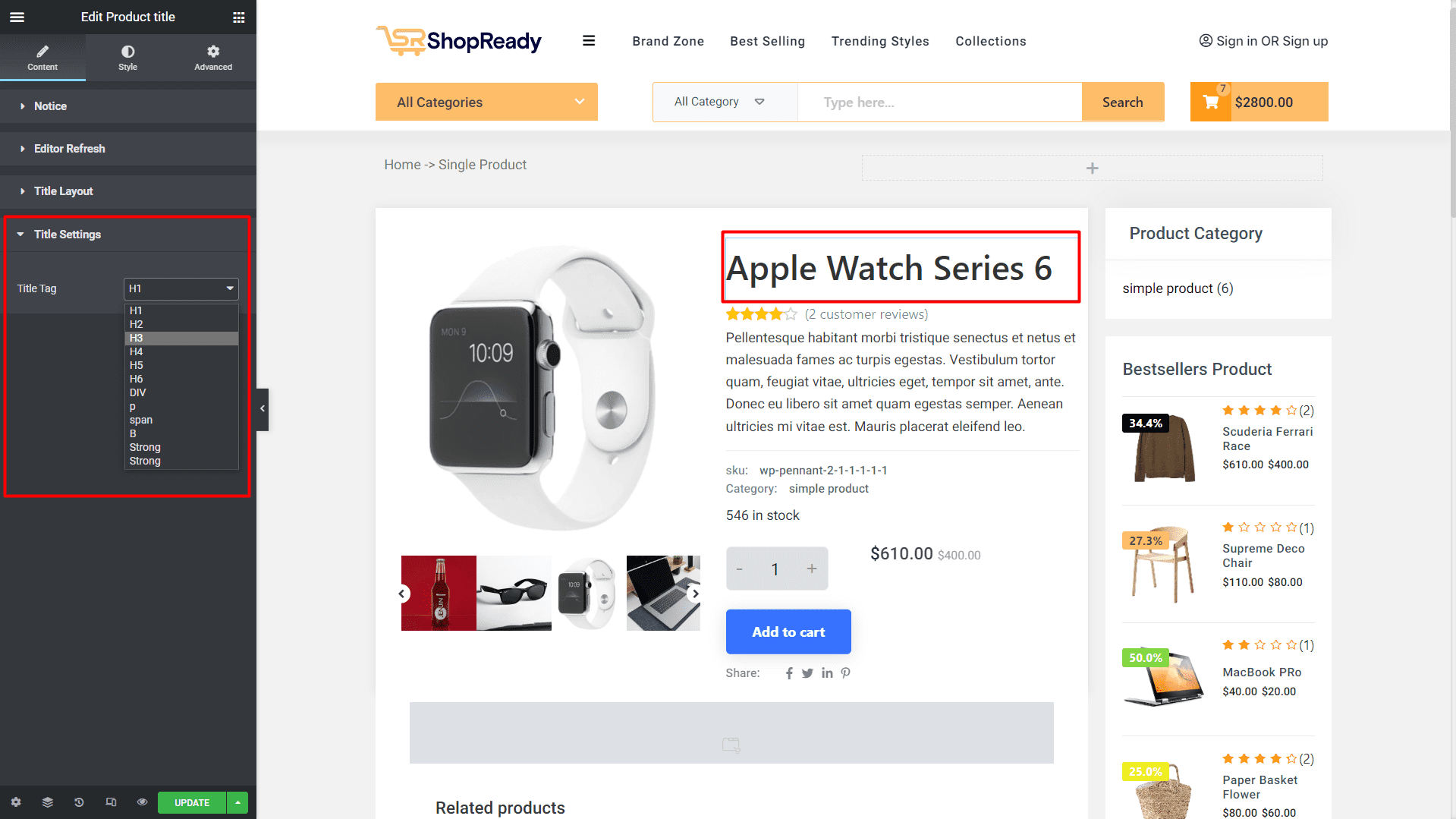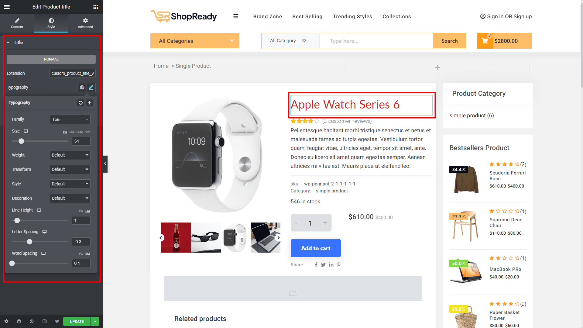 From the left-hand side, search for the ShopReady Product Title widget. And drop it into your newly created page.