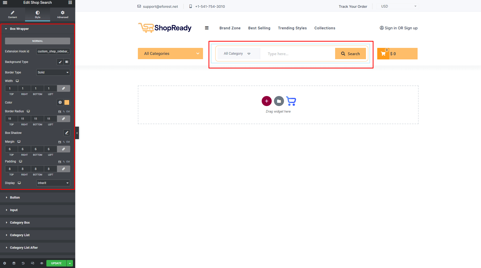You can further customize the search box; start by clicking on the Style tab. From here, you can change how the search box will appear by customizing the search box wrapper, search button, category box, etc.