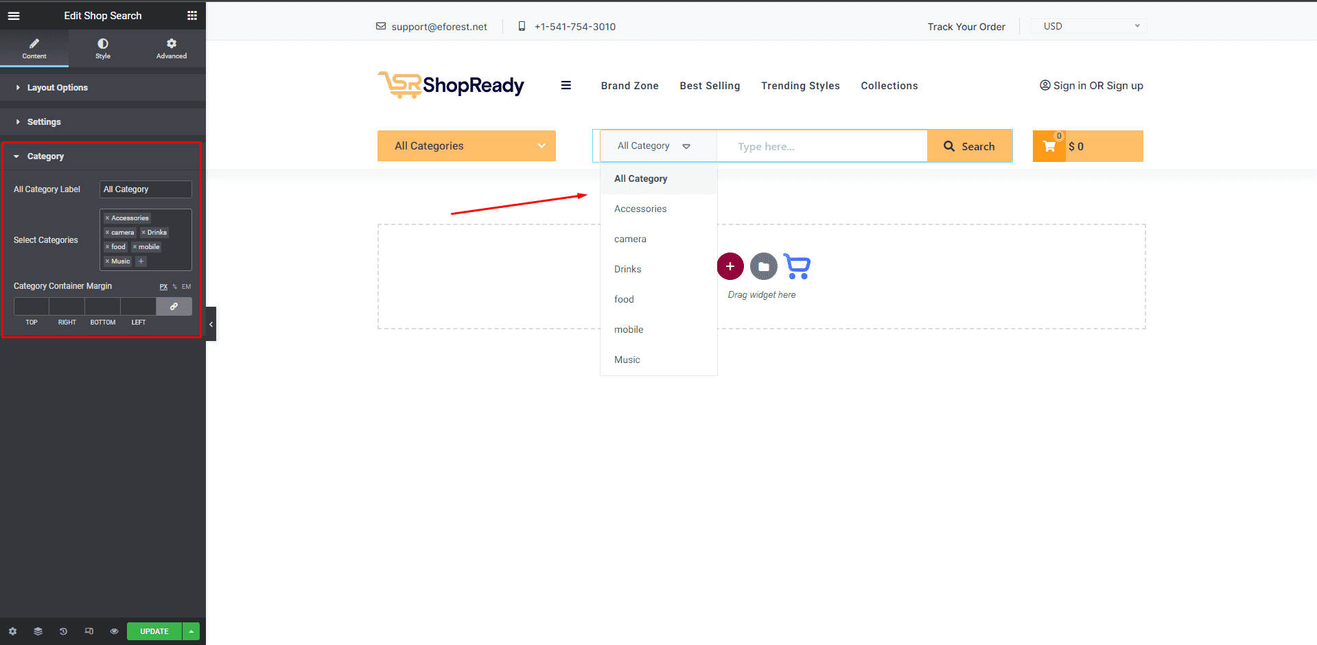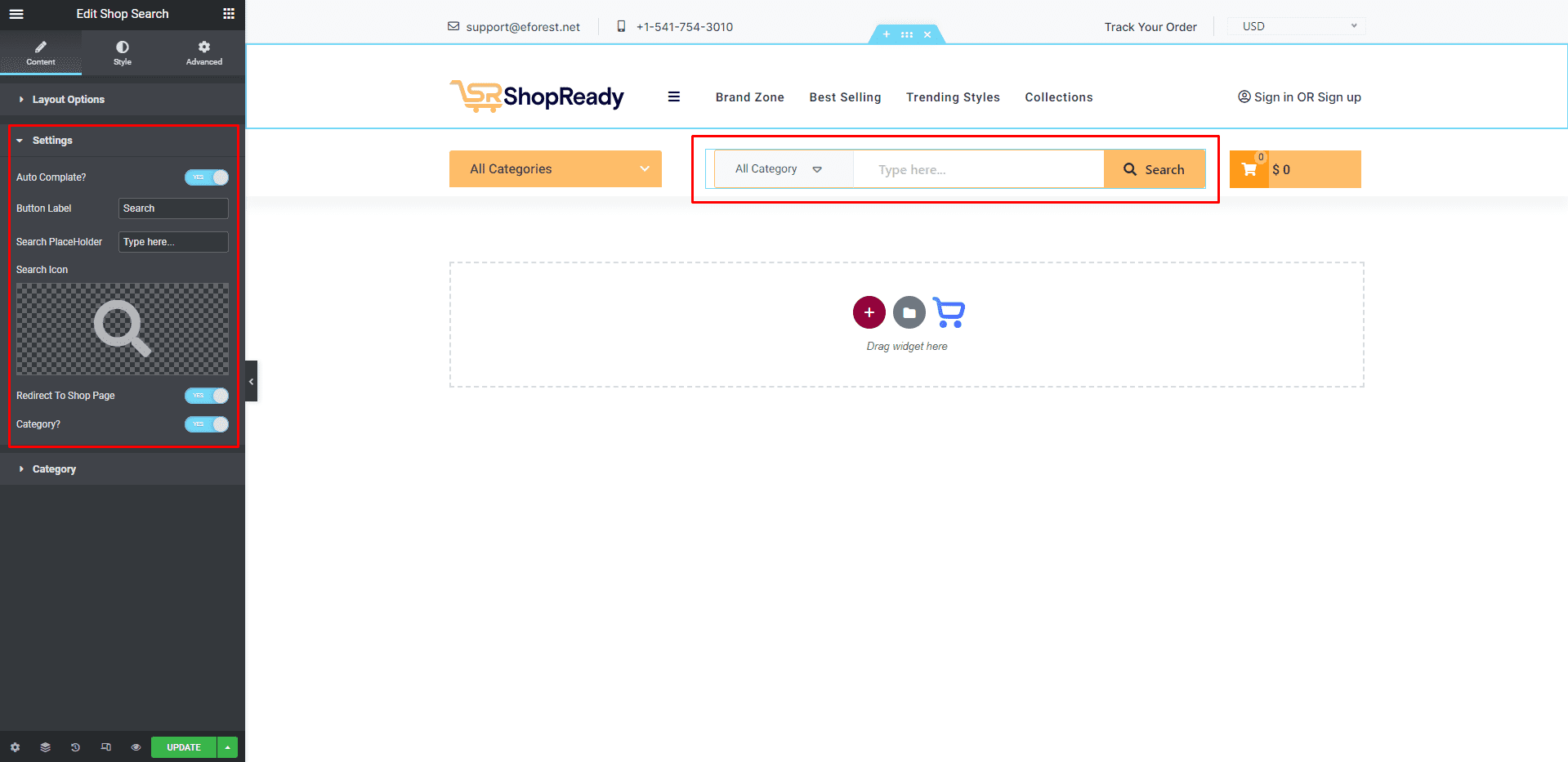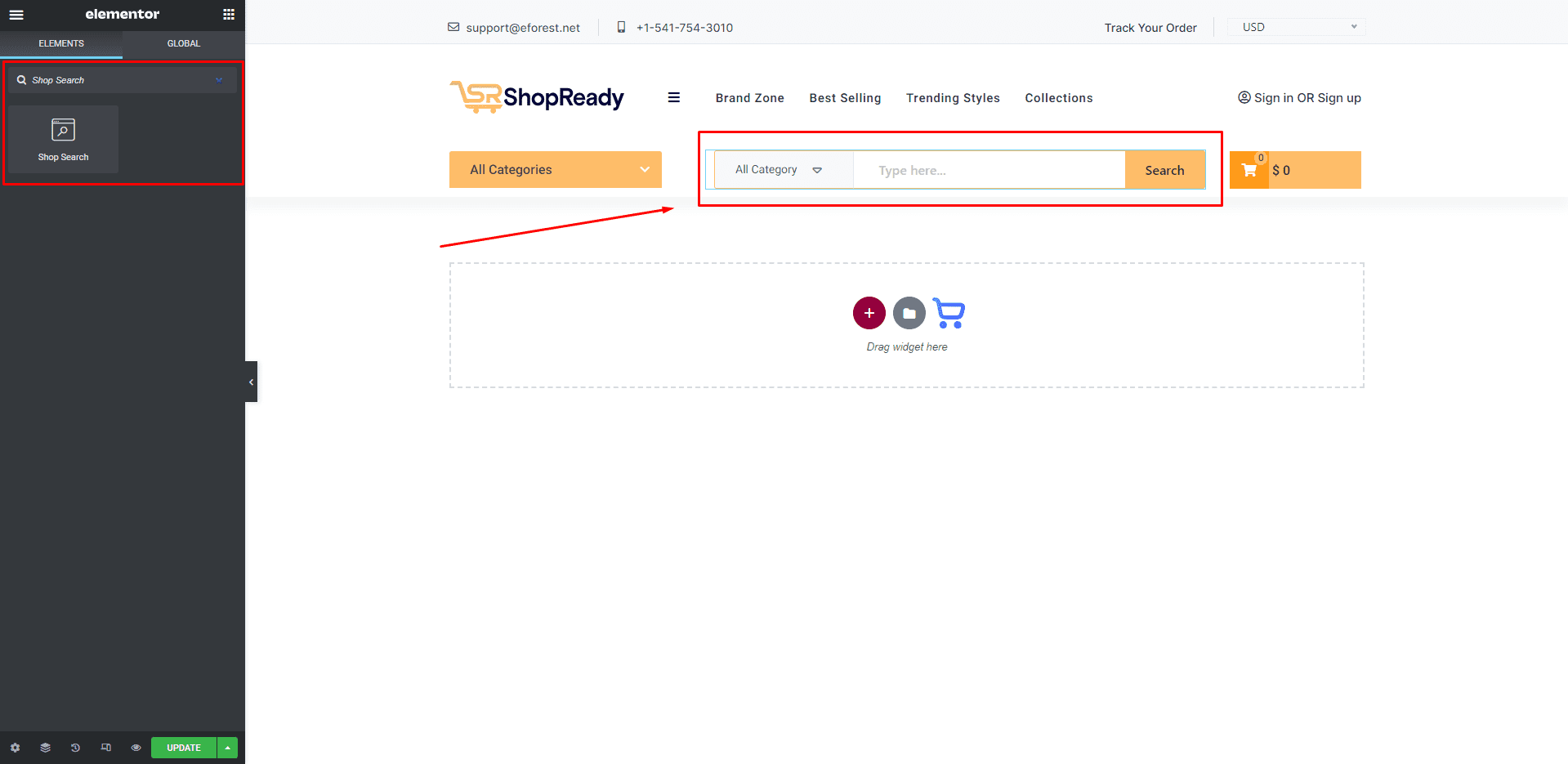 From the left-hand side, search for the ShopReady Search Shop widget. And drop it in the header section.