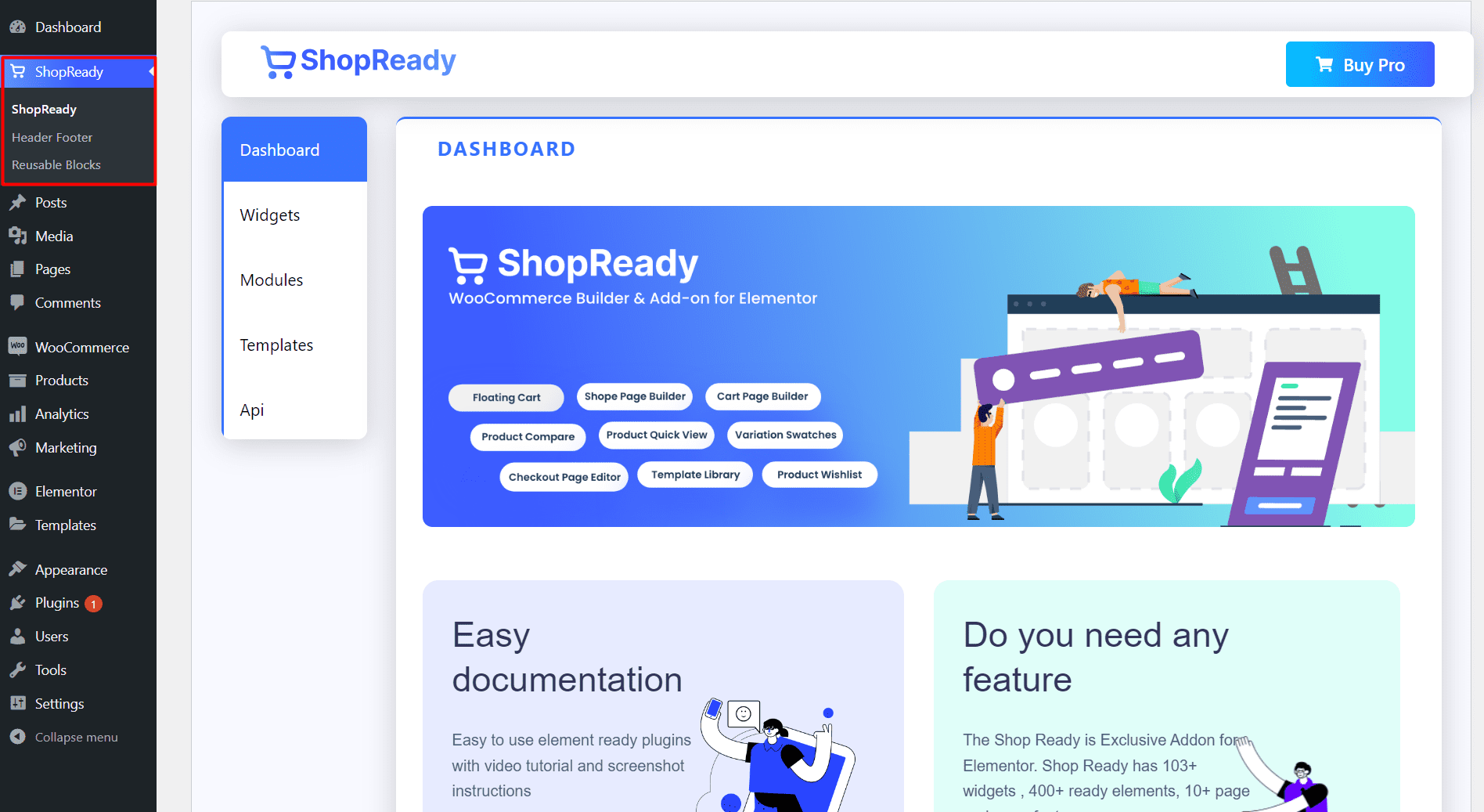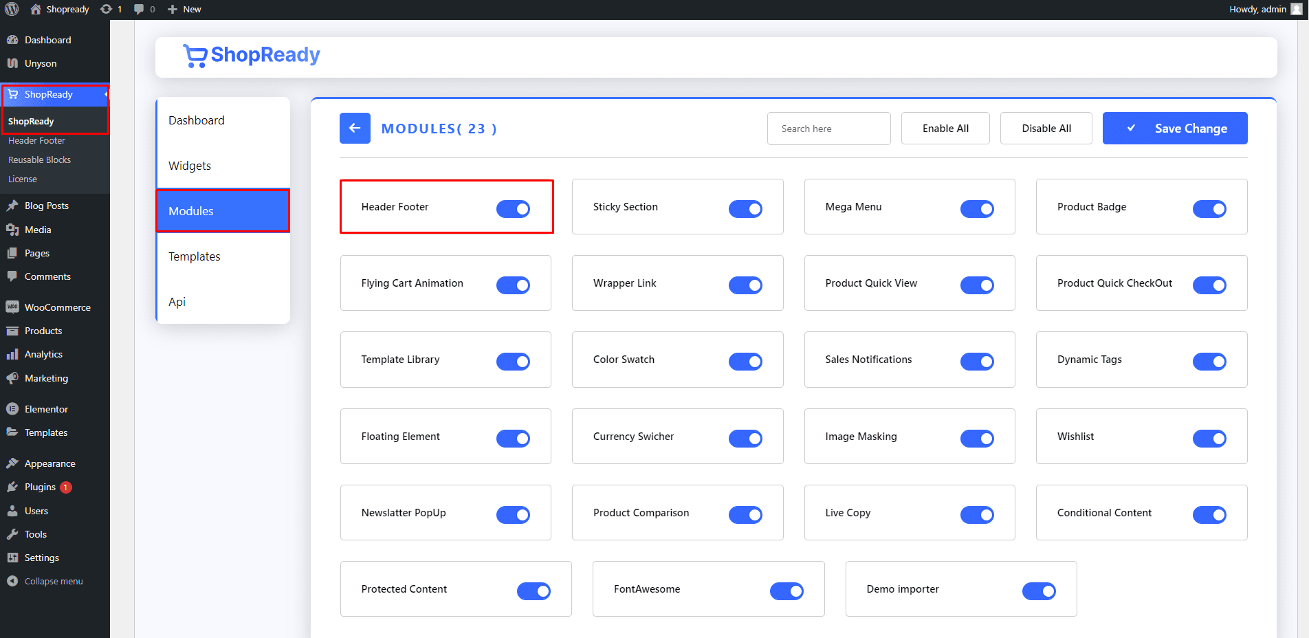 To use the Shop Search widget in the header section, you’ll need to enable the Header Footer module from the ShopReady dashboard and click on Save Changes.