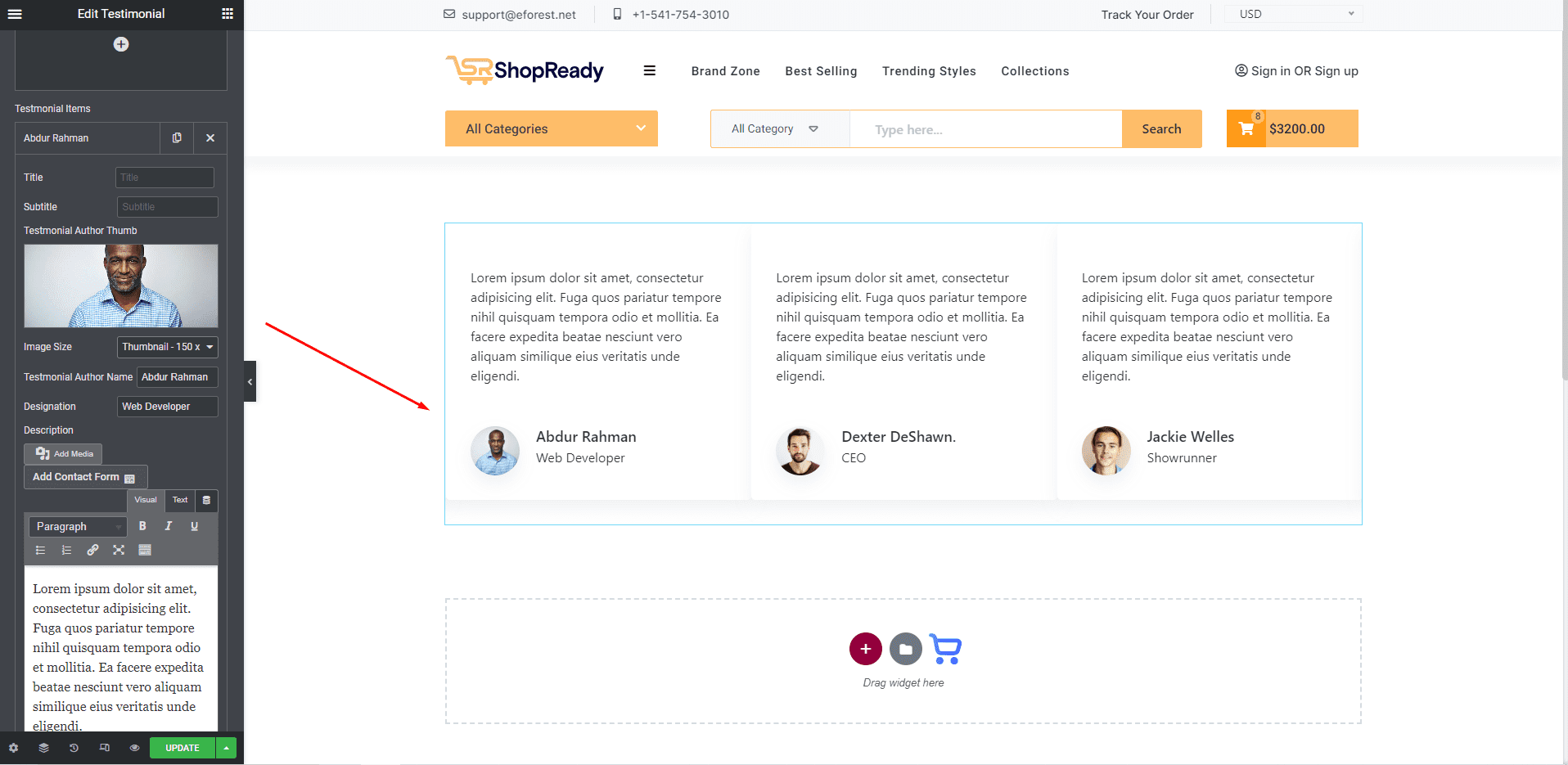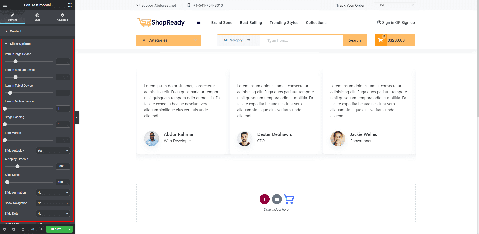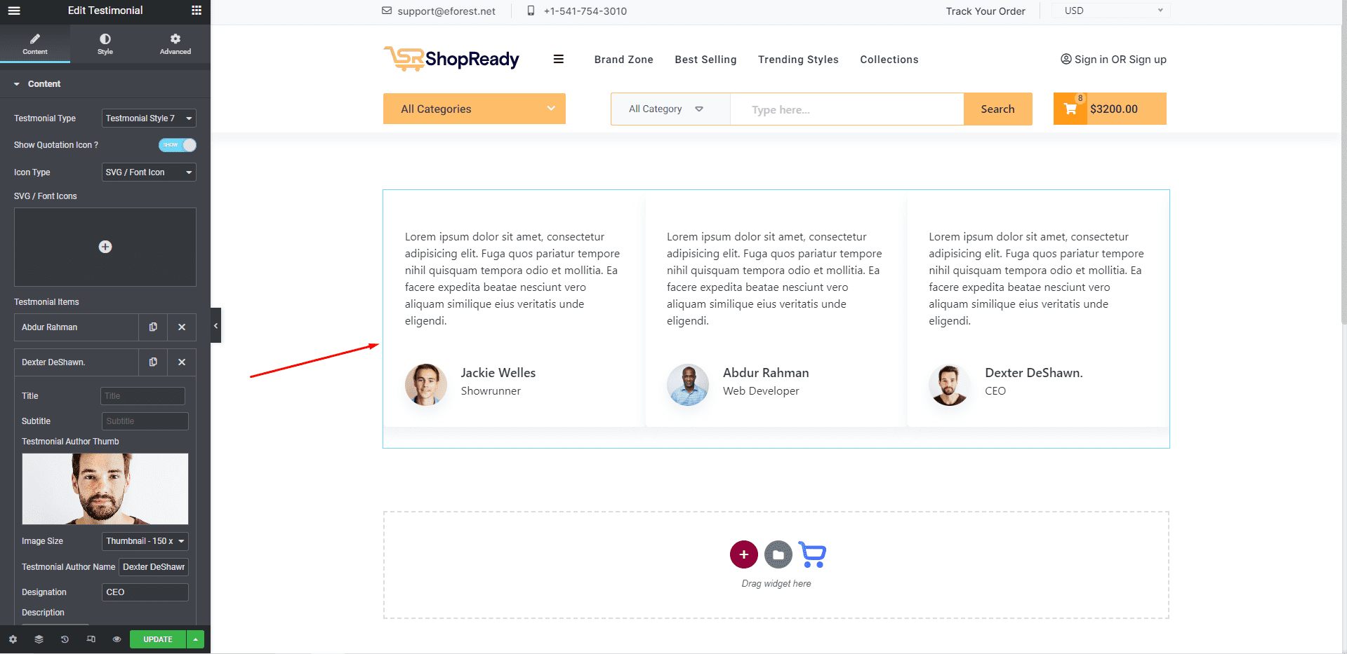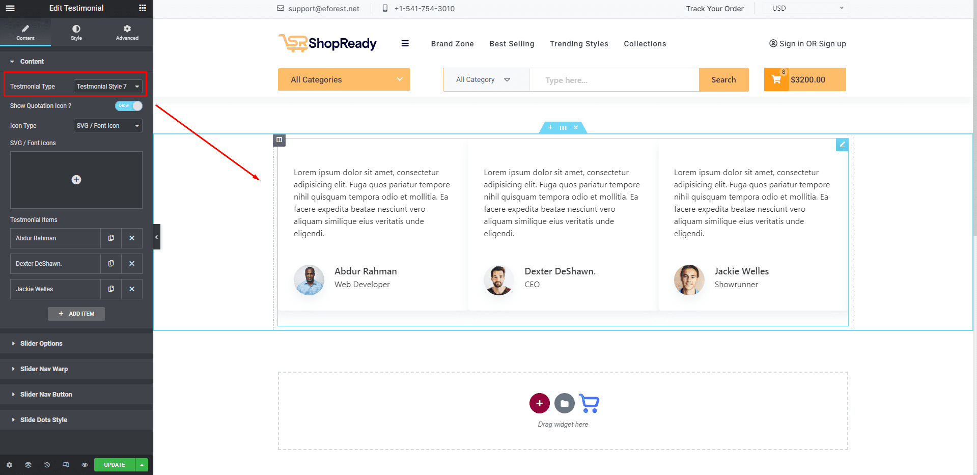 From the left-hand side, search for the ShopReady Testimonial widget. And drop it onto the newly created page.