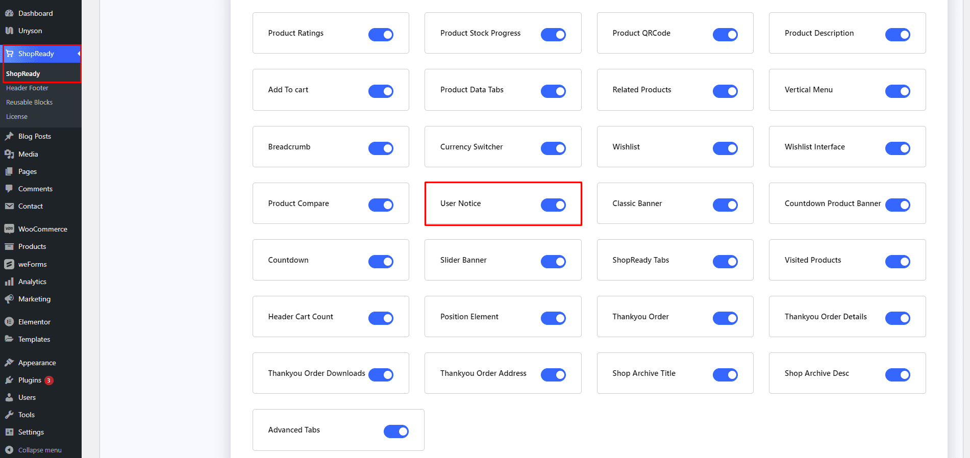 Enable the User Notice widget from the ShopReady dashboard and click on Save Changes