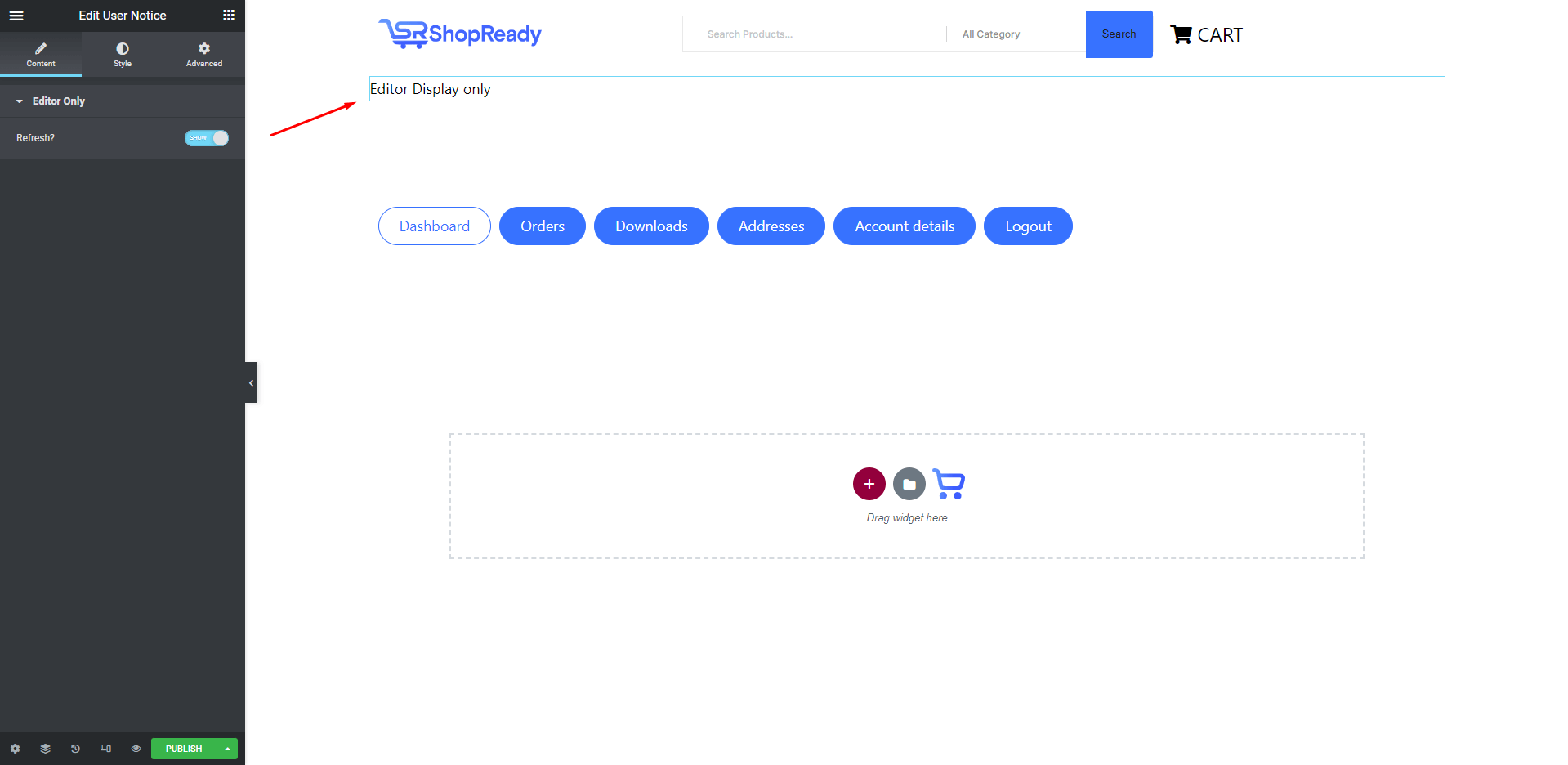 From the left-hand side, search for the ShopReady User Notice widget. And drop it onto the newly created page.