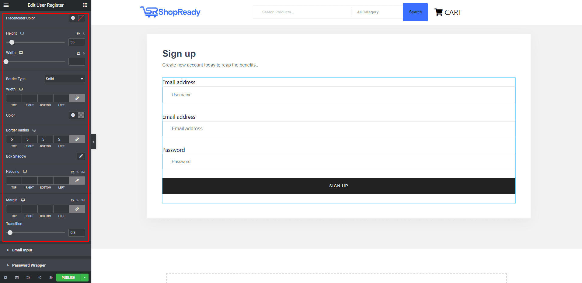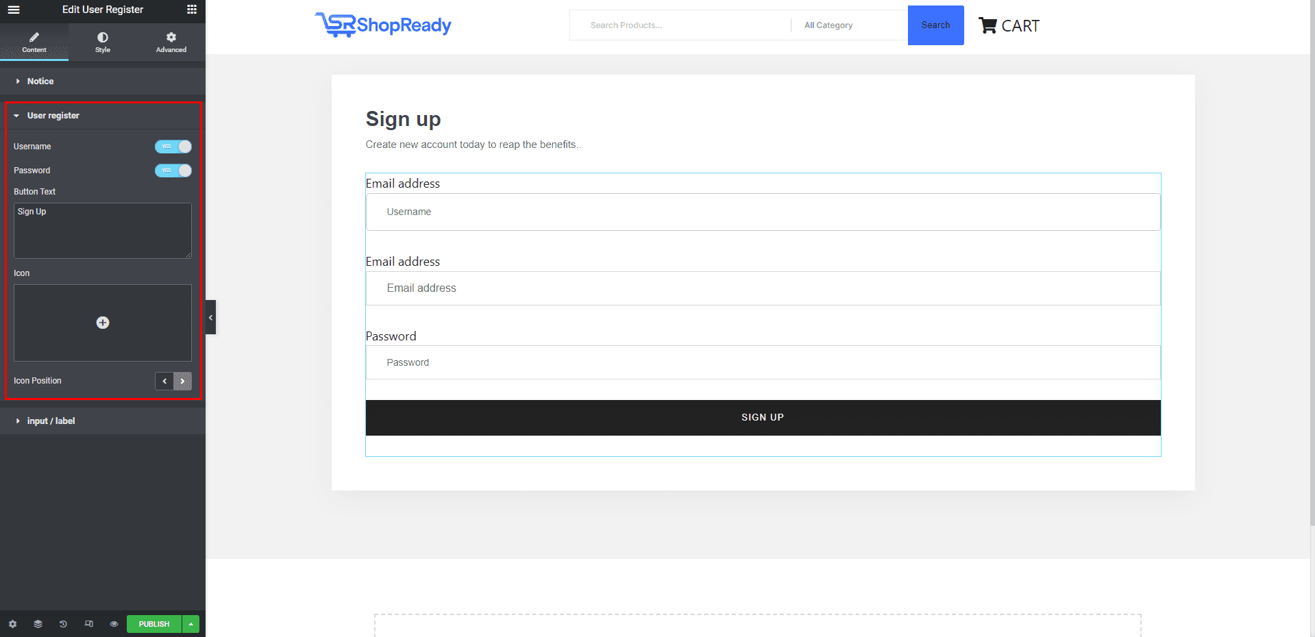 Enable the User Register widget from the ShopReady dashboard and click on Save Changes.