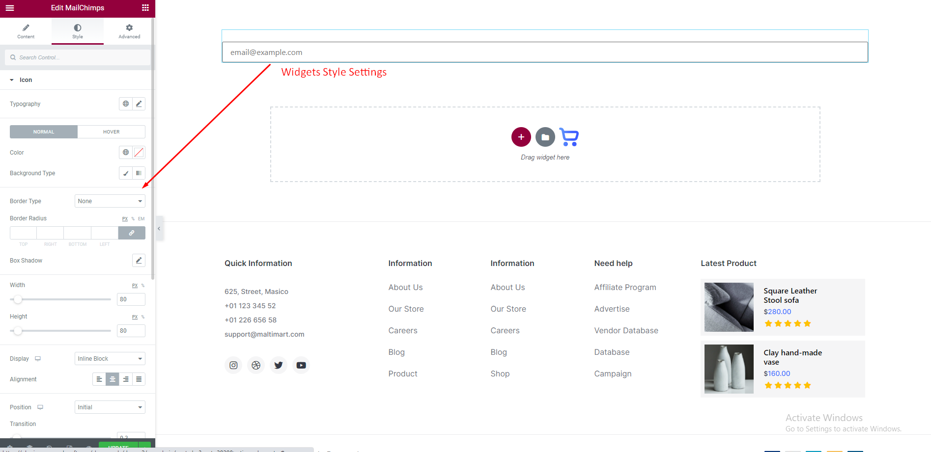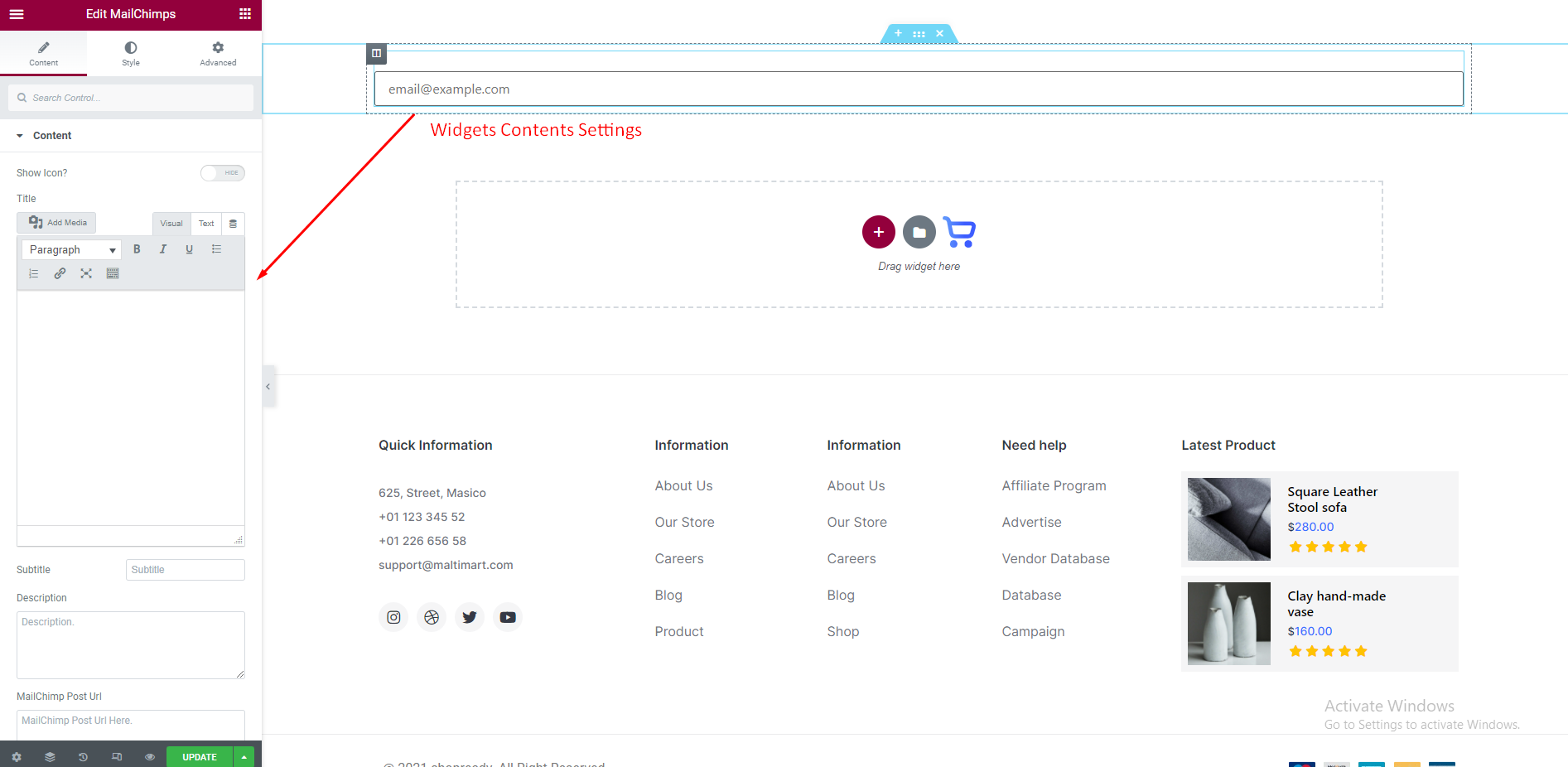 To set MailChimps Widget We just need idea about basic Elementor Widgets and how it works. As we all know this is a DRAG and DROP process. Just select the Widget from Elementor Dashboard and Drag it to your desire column or place. Now we will show you How to edit and customize the ShopReady Widgets.