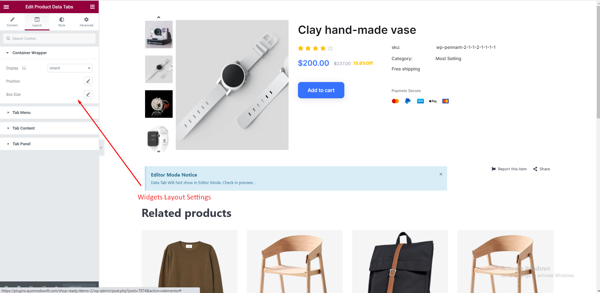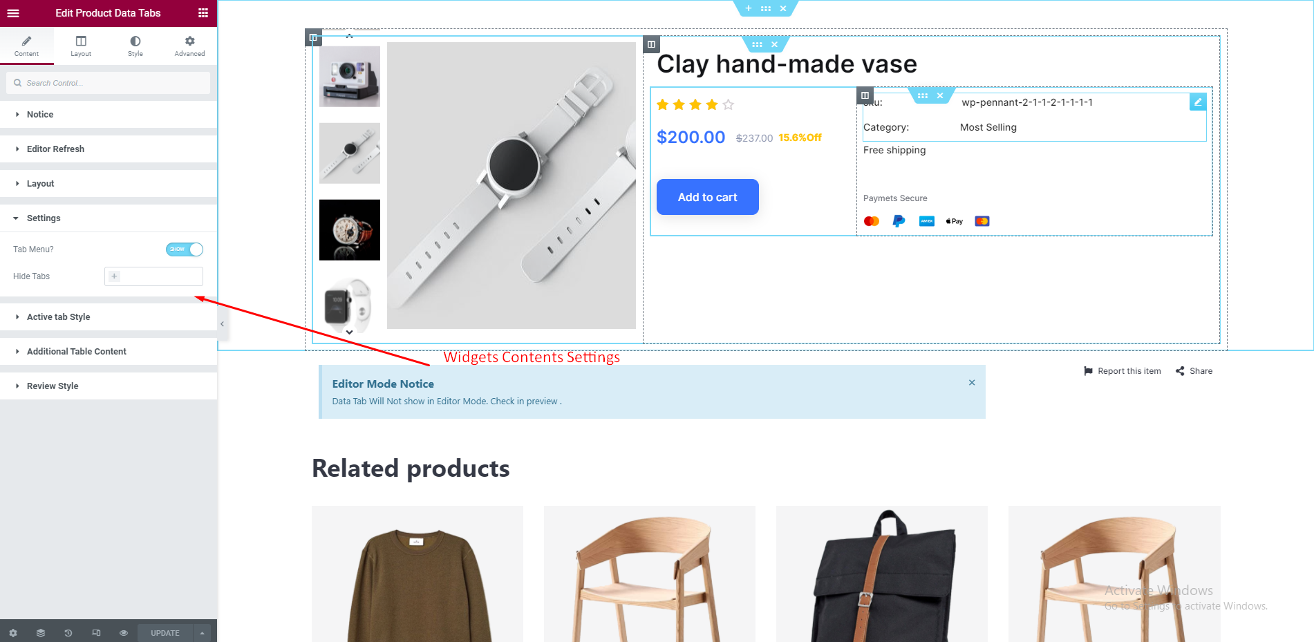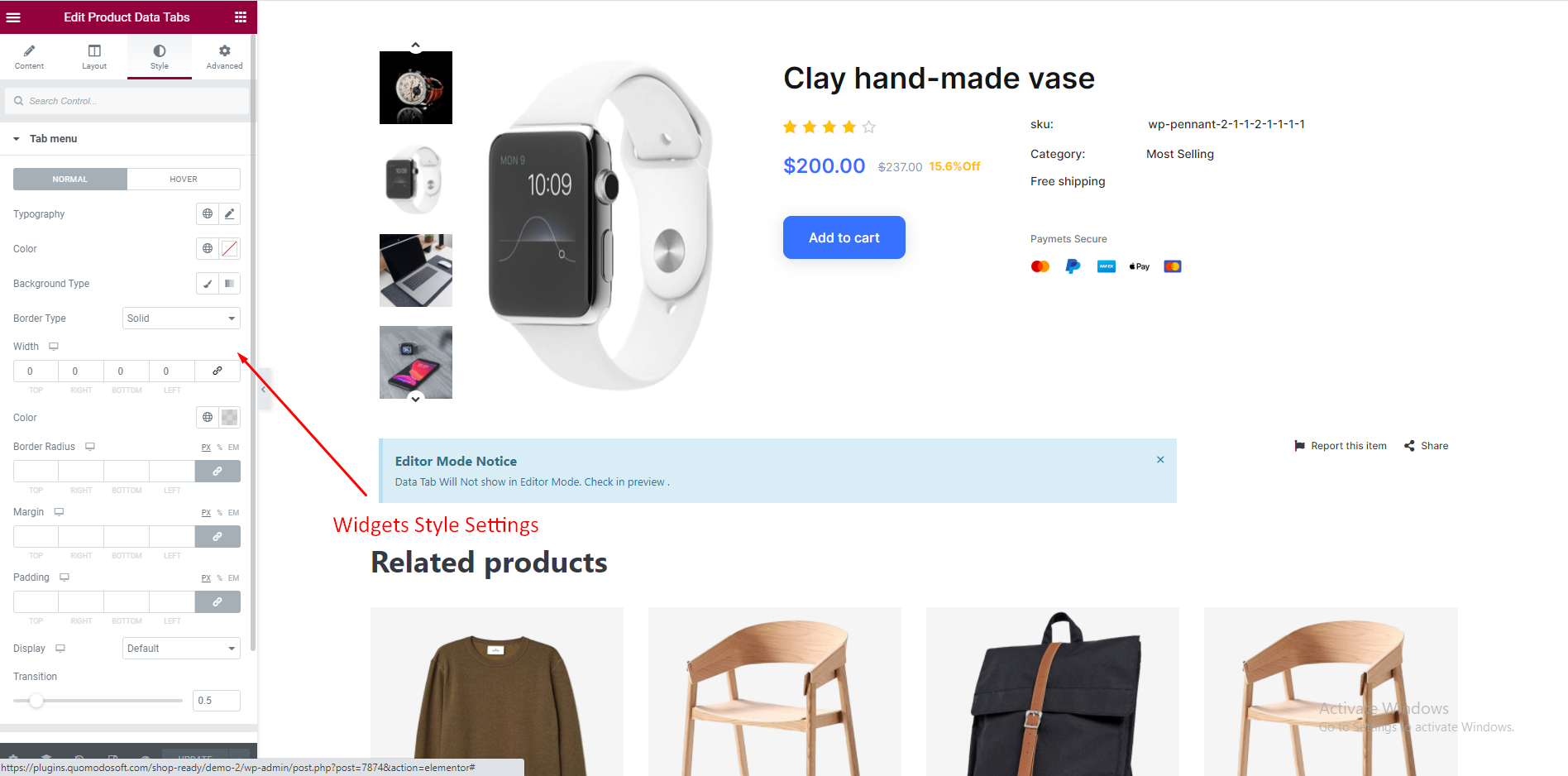 To set Product Data Tabs Widget We just need idea about basic Elementor Widgets and how it works. As we all know this is a DRAG and DROP process. Just select the Widget from Elementor Dashboard and Drag it to your desire column or place. Now we will show you How to edit and customize the ShopReady Widgets.