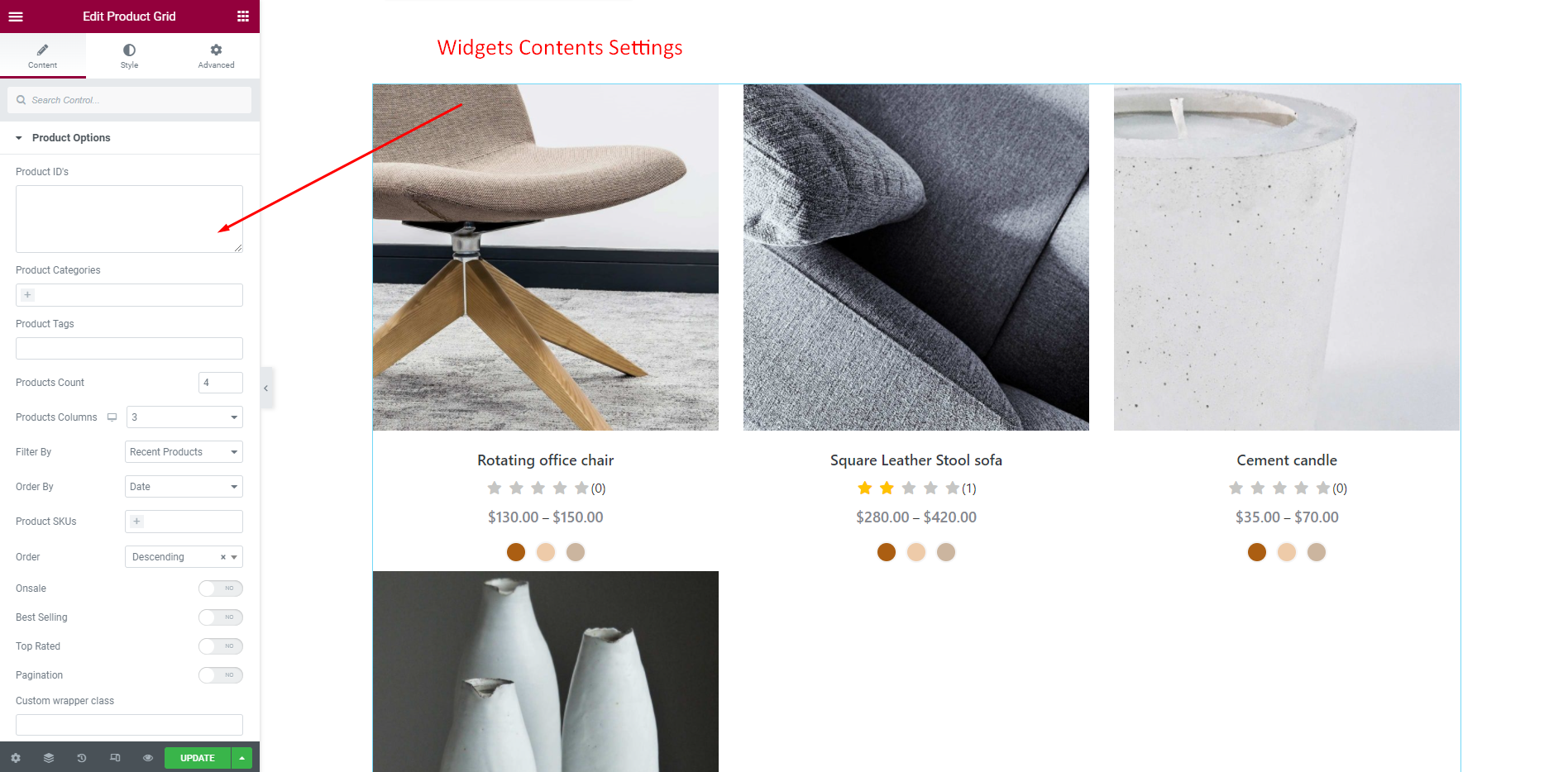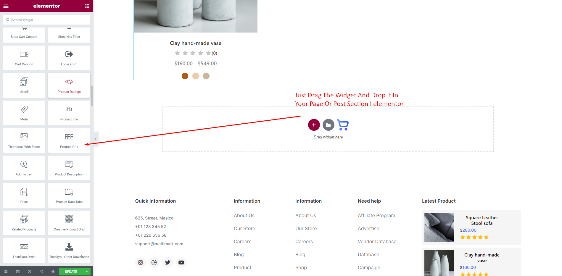To set Product Grid Widget We just need idea about basic Elementor Widgets and how it works. As we all know this is a DRAG and DROP process. Just select the Widget from Elementor Dashboard and Drag it to your desire column or place. Now we will show you How to edit and customize the ShopReady Widgets.