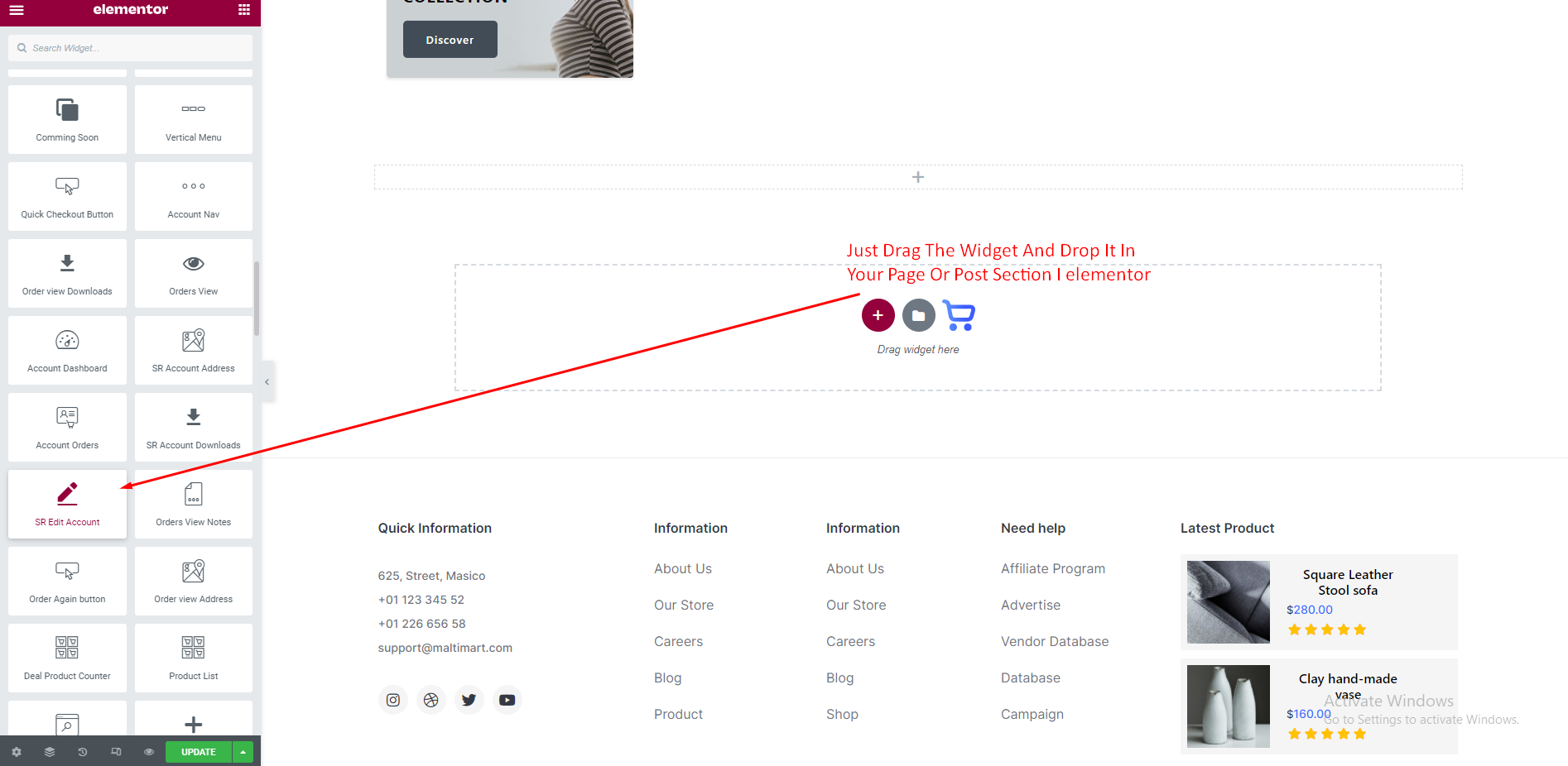 We just need idea about basic Elementor Widgets and how it works. As we all know this is a DRAG and DROP process. Just select the Widget from Elementor Dashboard and Drag it to your desire column or place. Now we will show you How to edit and customize the ShopReady Widgets.