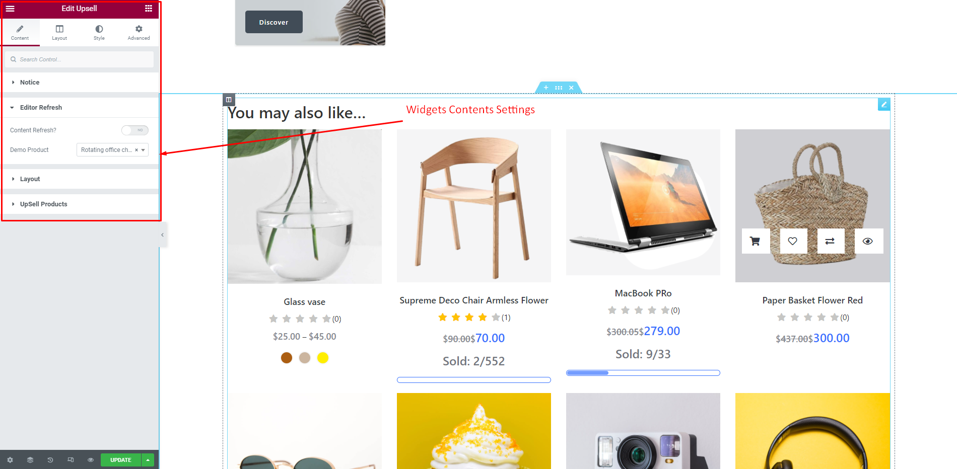 To set Upsell Widget We just need idea about basic Elementor Widgets and how it works. As we all know this is a DRAG and DROP process. Just select the Widget from Elementor Dashboard and Drag it to your desire column or place. Now we will show you How to edit and customize the ShopReady Widgets.